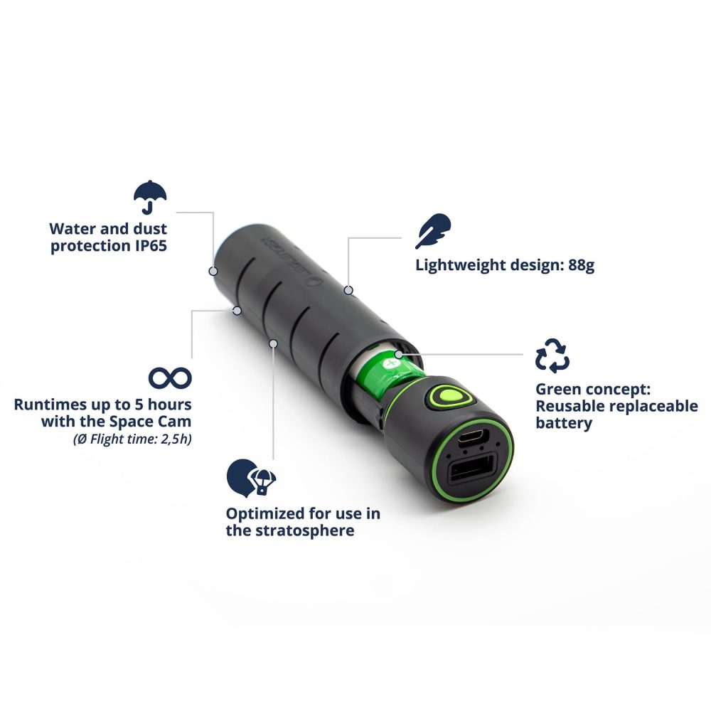La batería interna de una cámara de acción normal no es suficiente para la grabación completa del vuelo. Con la ayuda de este paquete de baterías especial, es posible multiplicar la potencia de la batería de la cámara. El paquete de baterías, que se fabrica en Alemania, se diferencia de los paquetes de baterías convencionales principalmente por sus celdas de alta calidad y bien aisladas. En comparación con las baterías convencionales o los bancos de energía del supermercado, este potente paquete de baterías ofrece mucha más seguridad en las temperaturas extremas de la estratosfera, de modo que su cámara graba de forma fiable todo el vuelo incluso en condiciones de frío extremo. El paquete de baterías, adecuado para actividades extremas, tiene un puerto USB convencional. En él se puede conectar el cable, que simplemente se conecta al puerto micro/mini o USB-C de la cámara y se enciende, lo que prolonga muchas veces la duración de la batería para la misión estratosférica. Además, el concepto ecológico provoca menos residuos electrónicos: si el rendimiento de la batería disminuye tras numerosos vuelos estratosféricos, la batería puede sustituirse fácilmente.