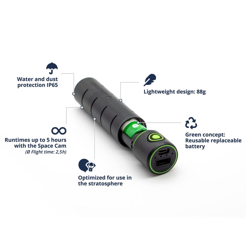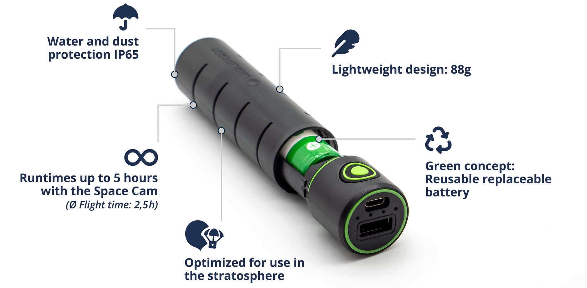 La batterie interne d’une action-cam normale ne suffit pas pour enregistrer entièrement le vol. Grâce à ce pack batterie spécial, il est possible de multiplier la puissance de la batterie de la caméra. Le Batterypack produit en Allemagne se distingue des Batterypacks traditionnels surtout par ses cellules de batterie de haute qualité et bien isolées. Ainsi, ce pack batterie performant offre une sécurité nettement plus élevée par rapport aux batteries traditionnelles ou aux powerbanks de supermarché lors des températures extrêmes de la stratosphère, de sorte que ta caméra enregistre de manière fiable tout le vol, même par grand froid. Le pack de batteries adapté aux activités extrêmes possède un port USB traditionnel. Il est possible d’y brancher le câble, qui se branche ensuite simplement sur le port micro/mini ou USB-C de la caméra et s’allume, prolongeant ainsi de plusieurs fois la durée de vie de la batterie pour la mission stratosphérique. De plus, le concept vert génère moins de déchets électriques : si la puissance de la batterie diminue après de nombreux vols stratosphériques, il est très facile de la remplacer.