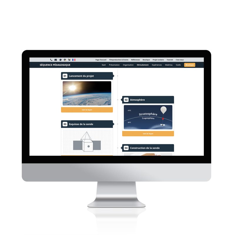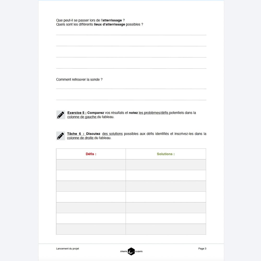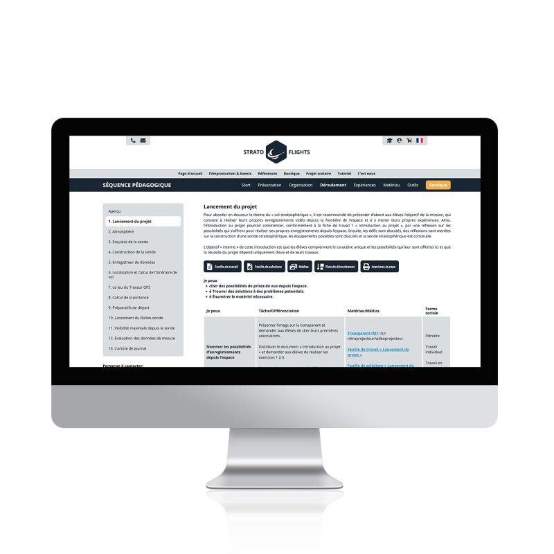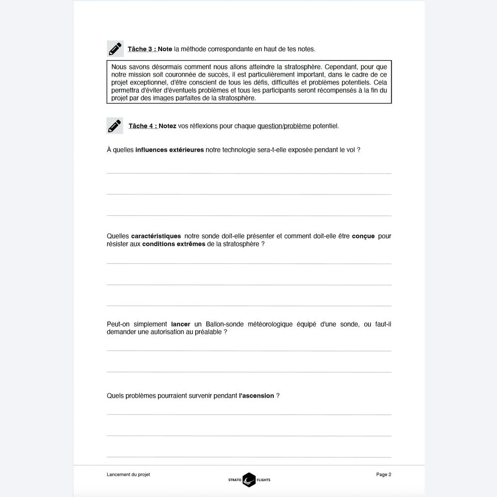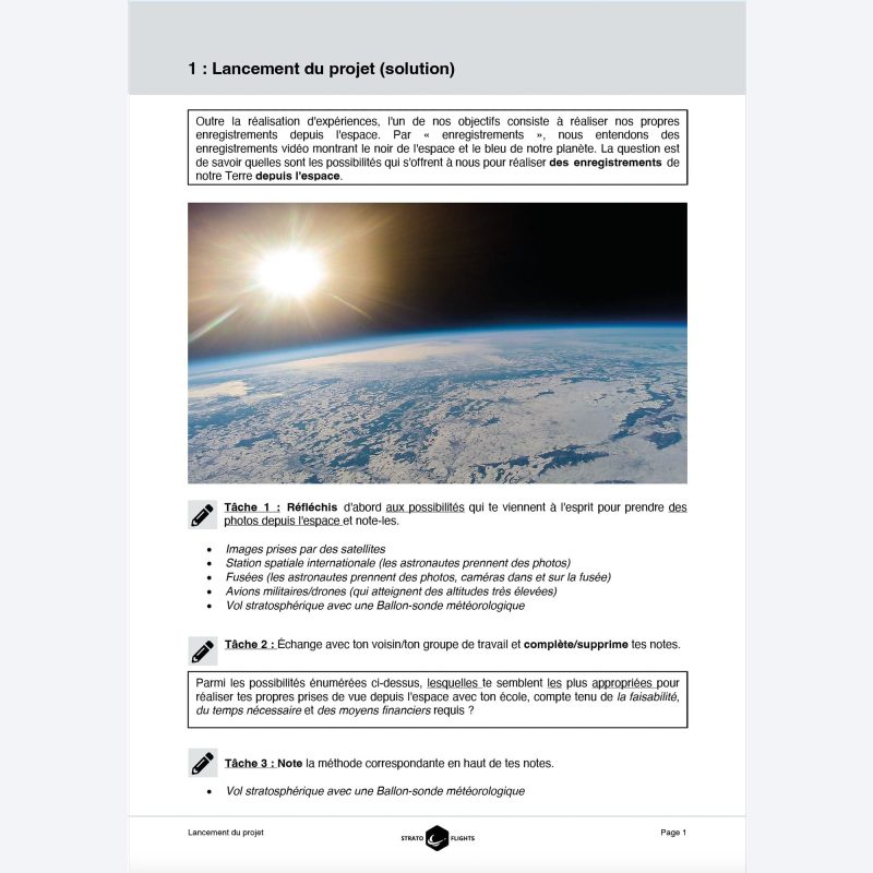 La séquence pédagogique convient à toutes les écoles secondaires et peut être adaptée individuellement aux besoins et aux niveaux d’âge. De plus, la séquence pédagogique interactive vous aide à préparer et à organiser vous-même la mission et vous prépare au projet avant même le premier cours double. Toutes les questions d’organisation trouvent ainsi une réponse sur un portail numérique, qui fournit également des conseils utiles : informations précieuses pour l’organisation, demandes de projet, contenus pédagogiques, présentation claire de tous les objectifs et avantages pour la direction de l’école, la presse et les sponsors potentiels. L’achat du produit vous donne accès à un portail en ligne qui regroupe de manière claire toutes les informations, tous les médias et tous les outils. De plus, le nombre nécessaire de feuilles d’exercices peut être imprimé en fonction de la taille de la classe, dans un souci de durabilité. La séquence pédagogique comprend également le Guide du ballon météorologique – Lancement et missions stratosphériques d’une centaine de pages.