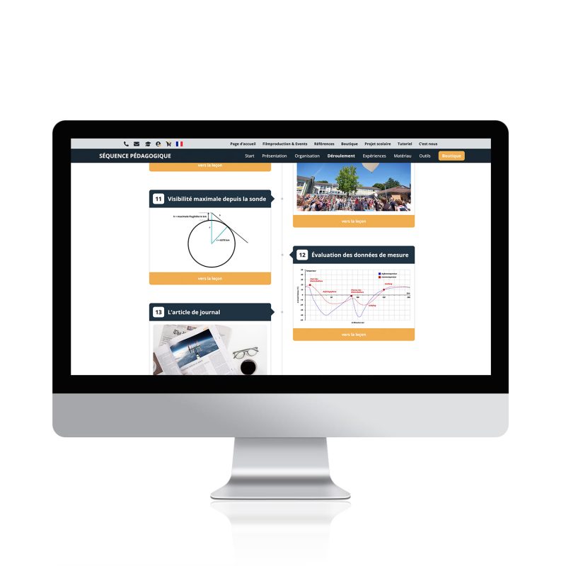 En tant qu’enseignant, utilisez la séquence pédagogique interactive pour votre projet scolaire MINT au bord de l’espace. Bénéficiez d’un concept didactique complet avec des plans de cours et des feuilles d’exercices et de solutions correspondantes, élaborés étape par étape pour 12 doubles heures de cours. Des contenus multimédias tels que des graphiques, des images, des vidéos et des outils accompagnent la séquence pédagogique, qui a été développée au cours de plusieurs mois de travail en collaboration avec des enseignants. En outre, la séquence pédagogique contient des propositions d’expériences détaillées dans diverses disciplines, y compris des évaluations des risques, qui sont constamment enrichies, de sorte que plus rien ne s’oppose à un véritable vol de recherche.