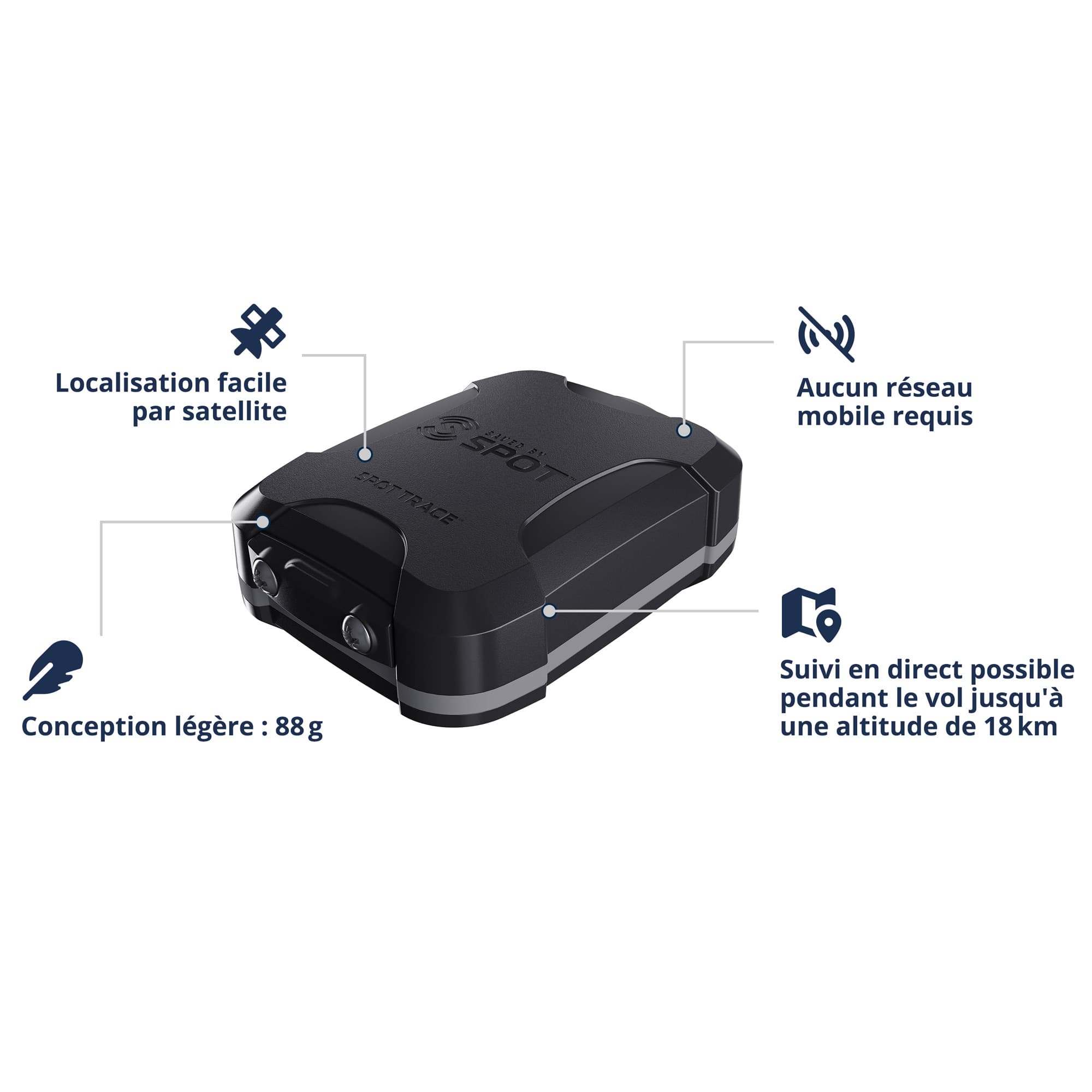 En utilisant la technologie satellite à 100%, SPOT Trace reste indépendant du réseau cellulaire. Les donnés de localisation sont transmis via le réseau satellite Globalstar qui est d’une ampleur quasi globale. Le système offre des piles longue durée, des alertes de mouvement et un intervalle de localisation qui peut être de 2,5; 5; 10; 30 ou de 60 minutes. Les donnés de positions sont transmis en temps quasi-réel. L’utilisation de l’application SPOT sur votre smartphone est facile et vous permet, en plus des donnés de position, de visualiser la position sur Google Maps. Utilisé avec le traceur GPS STRATOfinder, aucun obstacle ne vous empêchera de récupérer votre sonde.