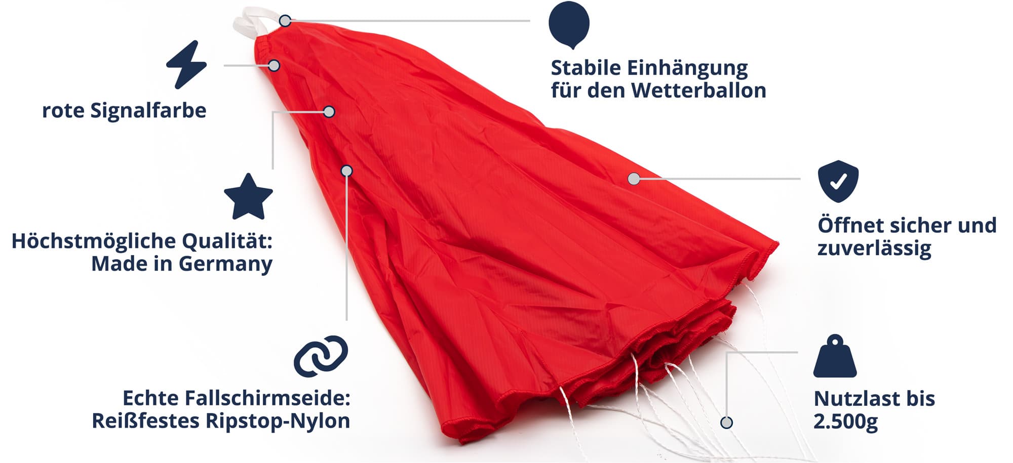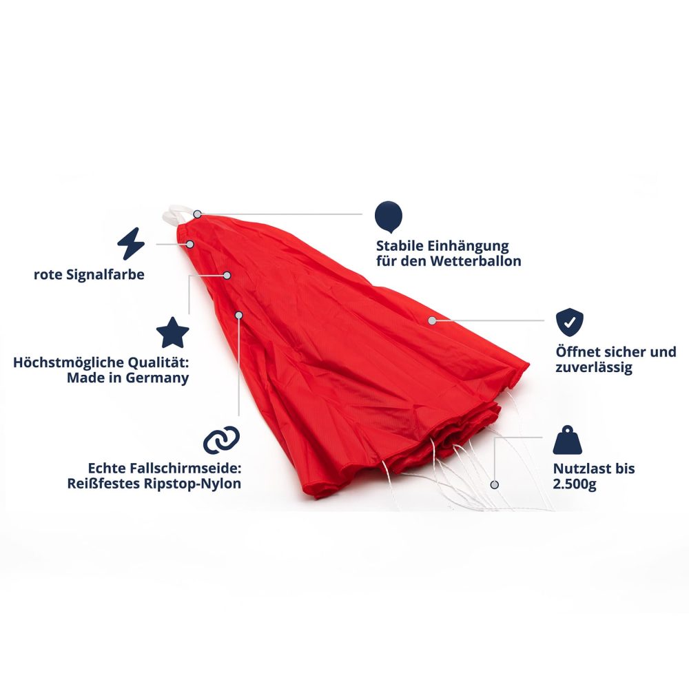 Der Fallschirm 2500 wurde von uns speziell für Stratosphärenmissionen mit einem Wetterballon designt. Mit einer Nutzlast von bis zu 2500 g ist er ideal geeignet, um auch mehrere Kameras und Messgeräte sicher zurück zur Erde zu bringen. Der Fallschirm besteht aus echter Fallschirmseide: Das superleichte und reißfeste Ripstop-Nylon-Gewebe knittert nicht und der Fallschirm öffnet sich nach dem Platzen des Ballons automatisch. Das in der Mitte befindliche “Loch” minimiert das Segeln des Fallschirms und reduziert damit die Distanz zwischen Start- und Landeort. Der Fallschirm wird mit Hilfe der Spezialschnur mit Wetterballon und Sonde verbunden. Die rote Signalfarbe erleichtert die Suche! Der Fallschirm 2500 ist Made in Germany.