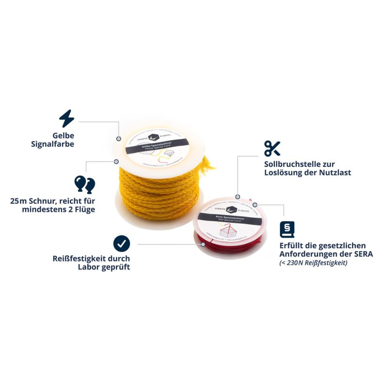 Mit diesem Set aus gelber und roter Spezialschnur verbindest du deinen Wetterballon sicher mit dem Fallschirm und der Styroporsonde – und erfüllst gleichzeitig alle offiziellen Sicherheitsvorschriften der in der EU gültigen SERA-Verordnung. Die gelbe Hauptschnur trägt das komplette Gespann aus Wetterballon, Fallschirm und Styroporsonde, während die rote Schnur als vorgeschriebene Sollbruchstelle fungiert. Beide Schnüre lassen sich leicht knoten, ribbeln nicht auf und werden in ausreichender Länge geliefert – perfekt für einen sicheren, regelkonformen und erfolgreichen Start eines Wetterballons in der EU.